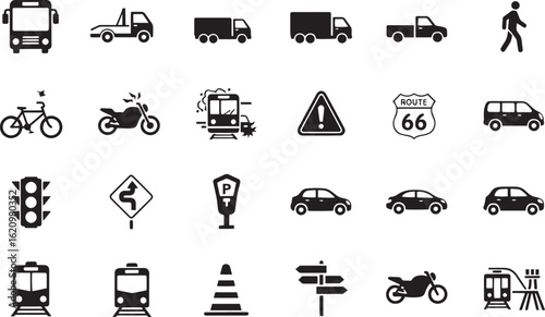 Collection of transportation icons including cars, trucks, buses, trains, and traffic signs isolated on white background