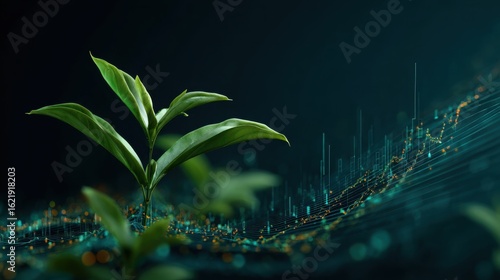 A young plant growing with digital data visualization overlay, symbolizing growth, technology, and innovation in agriculture or environmental science.