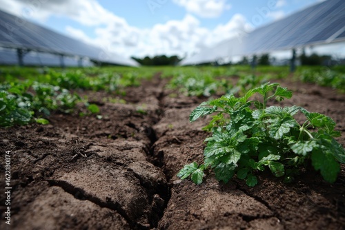 Cracked soil with green plants and blurred solar panels under blue cloudy sky. It shows sustainable agriculture and renewable energy sources.