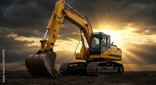 Yellow excavator positioned on dark soil under a dramatic sky with sun rays shining through clouds