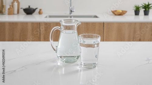 Close-up of a jug and a glass filled with clear water on a white kitchen surface