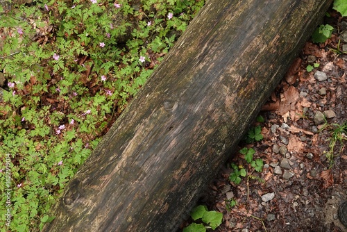 Gruba, mokra kłoda drewna leżąca na runie leśnym