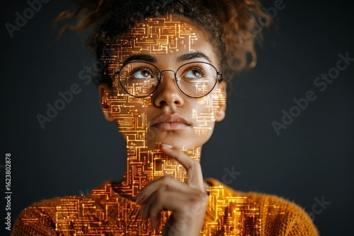 Ai and ethics: student amidst digital overlay of decision trees. Education trends. Navigating ai challenges in contemporary school systems. Learning transformation. Global networking.