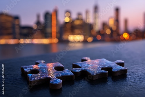 Dark Surface Display of Cityscape Puzzle Assembly