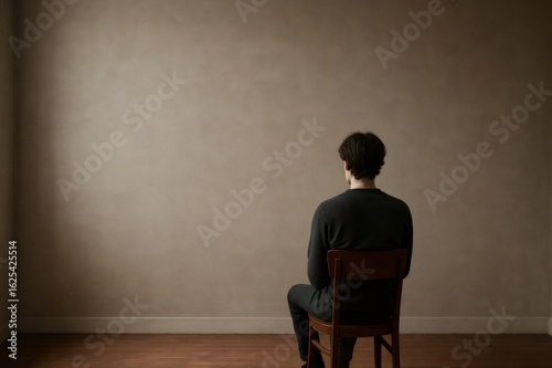 Young man sitting on chair contemplating a blank wall in dimly lit room, creating a sense of quiet reflection and introspection