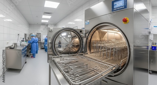 Surgical Instrument Sterilization Room with Stainless Steel Autoclaves and Medical Personnel in Blue Scrubs Clean and Tiled Facility Highlight Surgical Instruments and Medical Equipment