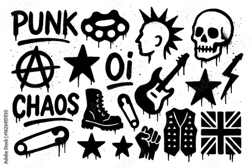 Punk subculture icons with mohawk, skull, anarchy symbol, and guitar in graffiti stencil style, Transparent Background
