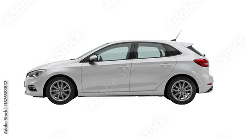 Sleek white hatchback car with aerodynamic design isolated against a transparent digital space,