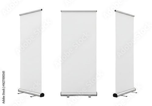 Set of three blank white roll up banner stand mockups from different angles. Isolated on transparent background, png