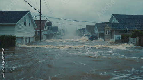 Flooded Street: An unsettling image captures a street submerged in floodwaters, with houses on either side and ominous clouds overhead, symbolizing the destructive power of natural disasters.