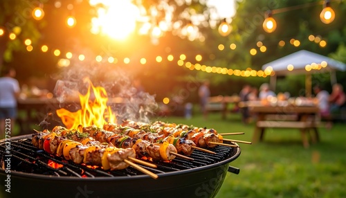 Grilling Kebabs Over Fire at Outdoor Party with String Lights