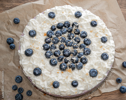 Tort z kremem na górze, widok z góry, obsypany owocami jagodami
