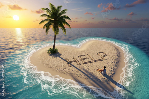 Rozbitek na wyspie miłości czeka na pomoc, tropikalna wyspa, złamane serce
