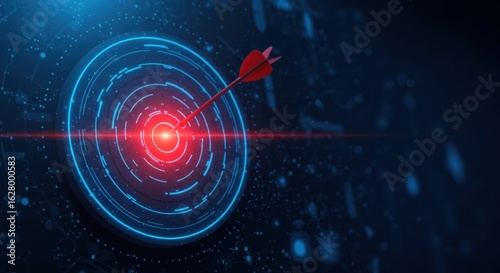 Precision aiming success digital target board with glowing red bullseye and flying arrow achieving the goal
