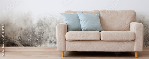 A beige sofa with two blue cushions is placed against a wall covered in mold. Home damage problem