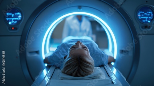 Female Patient Receiving MRI Scan in a Hospital - Advanced Magnetic Resonance Imaging Equipment for Enhanced Health Care