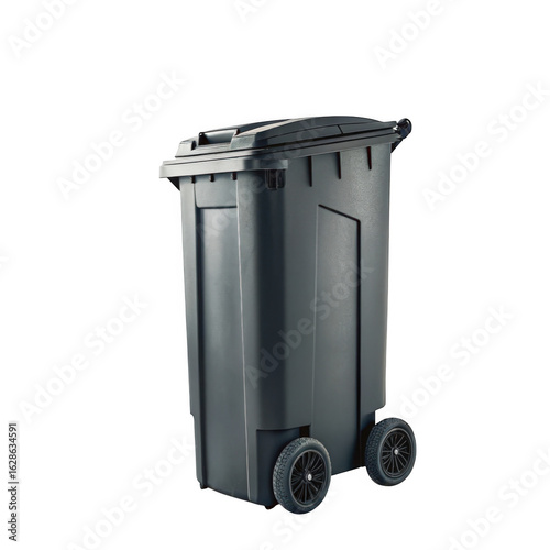Dark gray wheeled outdoor trash can with lid isolated on transparent background