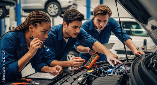 Cooperative problemsolving on vehicle lighting and circuitry by aspiring mechanics.