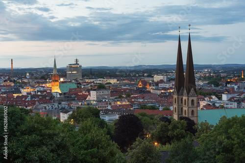 Stadtpanorama von Bielefeld in Nordrhein-Westfalen, aufgenommen von der Sparrenburg aus, mit Blick auf die Neustädter Marienkirche – ein charakteristisches Stadtbild im Herzen Deutschlands