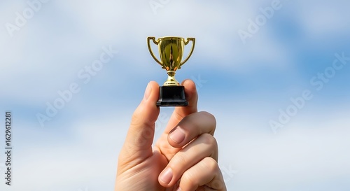 Tiny Golden Trophy Held in Hand Against Blue Sky Background