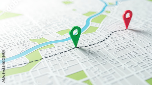 Map with location markers green and red pins urban layout navigation route planning city streets geographic representation travel