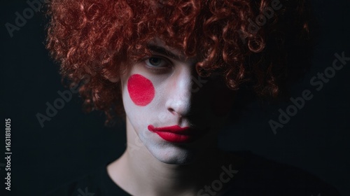 A mysterious young Hispanic male clown with vibrant red curls evokes Halloween's eerie allure and the whimsicality of World Circus Day