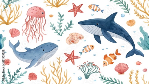 watercolor seamless pattern with underwater world