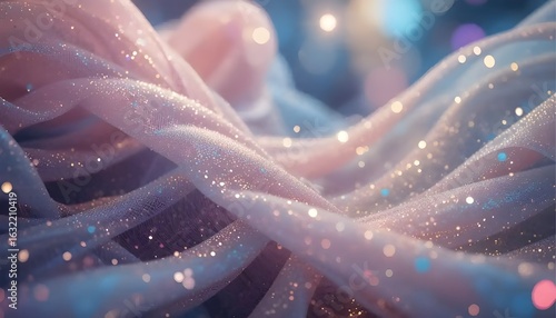 Magical peach soft tulle fabric embedded with glitter being spread gently, sparkling highlights, colorful bokeh lighting, fantasy inspired.