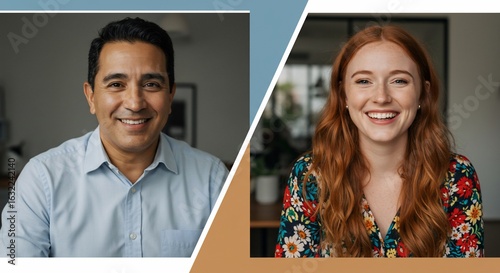 Two smiling individuals in separate frame halves