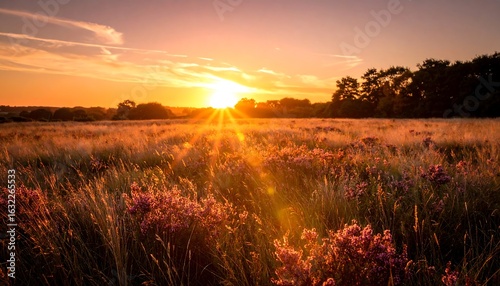 Golden light bathes a heath landscape, capturing the serene beauty of nature at sunrise or sunset