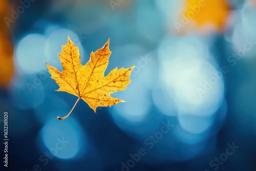 Golden maple leaf falling in blue sky