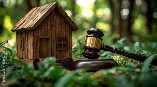 Miniature wooden house and gavel on moss-covered ground in forest