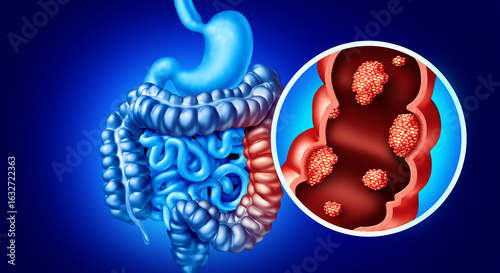 Colorectal cancer concept as a colon disease medical illustration of a large intestine with a malignant tumor growth disease of the digestive system.