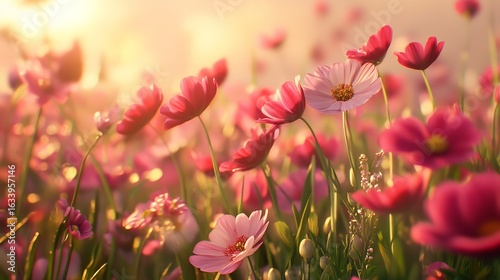 A dreamlike field of pink and red cosmos flowers swaying gently in the breeze bathed in warm sunlight with shallow depth