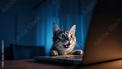 Curious tabby cat with wide eyes and tongue out playfully interacting with a laptop keyboard in a dimly lit room with blue ambient light