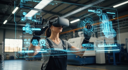 VR Trainee Woman Immersed in Digital Simulation for Industrial Training with Future Tech