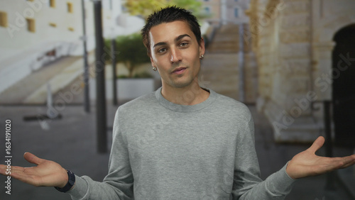 Young man outdoors in casual attire gestures with a questioning expression in an urban setting indicating confusion or ambiguity