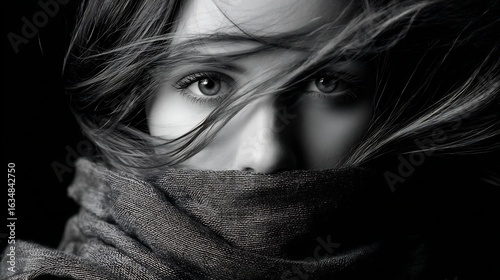 Wind blowing scarf across womans face dramatic autumn fashion portrait high contrast black and white