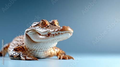 Professionally lit studio featuring a crocodile, with soft lighting highlighting its formidable features and textured scales against a minimalistic backdrop.