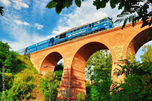Łagów Polska Niebieska lokomotywa z wagonami na zabytkowym ceglanym wiadukcie.