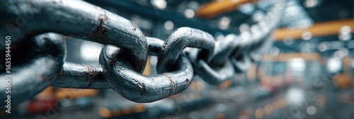 Chain link in focus with industrial background showcasing strength and durability in a warehouse setting
