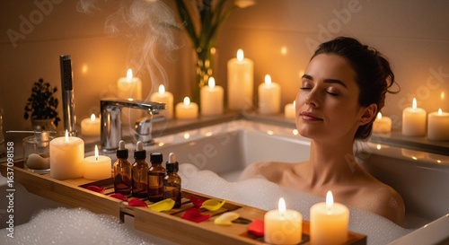 A serene stock photo of a woman enjoying a bubble bath in a dimly lit bathroom, surrounded by candles and essential oils.