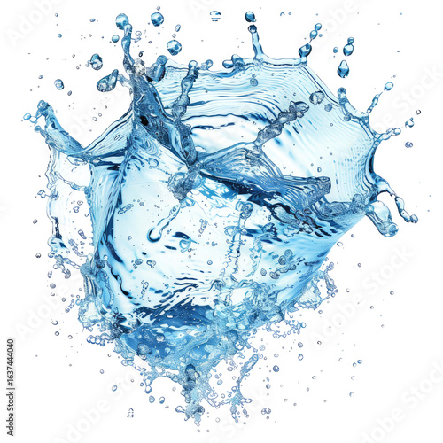 A vibrant water splash, light blue in color, radiates outward against a black background. Detailed, dynamic burst of liquid