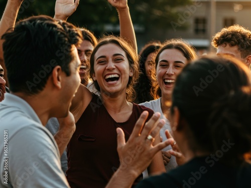 A joyful group of young adults, bathed in golden hour light, laughing heartily outdoors, expressing genuine happiness and camaraderie.
