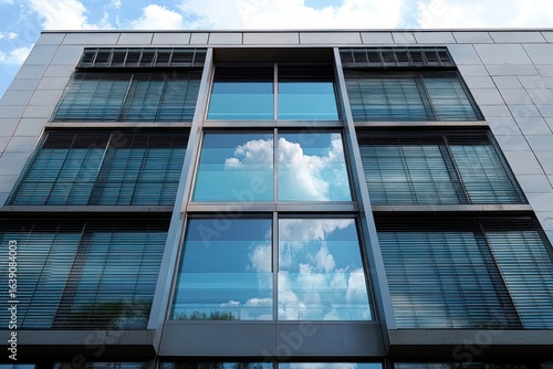 Modern building facade with large glass windows reflecting blue sky and white clouds under bright daylight