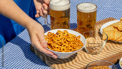 A cheerful Caucasian man enjoys Oktoberfest delicacies with foamy beer, salted pretzels, and sunlit camaraderie on checkered tablecloth