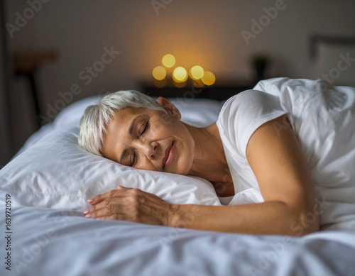 Una mujer mayor descansando durante la noche dormida en una cama con sabanas y almohada blanca en un dormitorio con luz