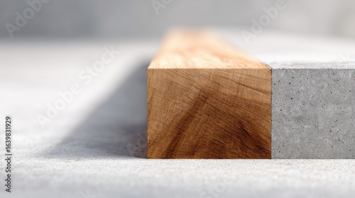 Close up of hybrid timber and concrete joint with bright daylight showing texture and contrast between materials in construction detail