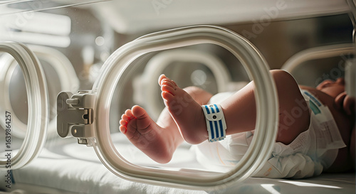 Infant in incubator with diaper and identification bracelet. A hopeful close-up capturing newborn care. Healthcare, medical treatment, neonatal care.