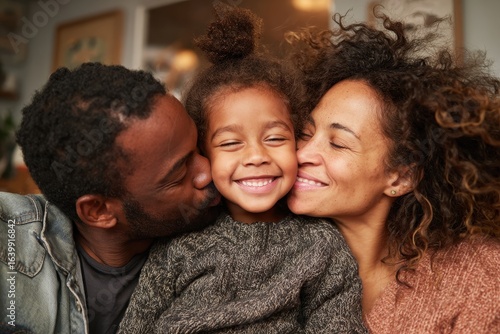 Image of a joyful Black family enjoying time together at home featuring a smiling African American father mother and their young daughter